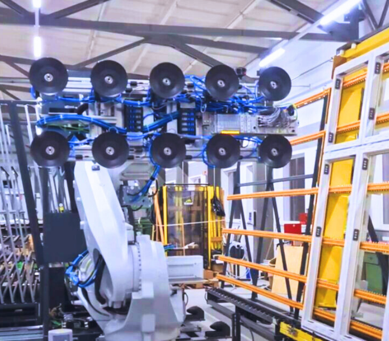 Glasrobot voor het herkennen en meten van de glasschijven op een glasbok. Het glas wordt door de robot automatisch weggenomen van de glasbok en verplaatst naar het automatisch buffersysteem. Bij het beglazen kan de robot het glas automatisch inzetten in de afgewerkte elementen.